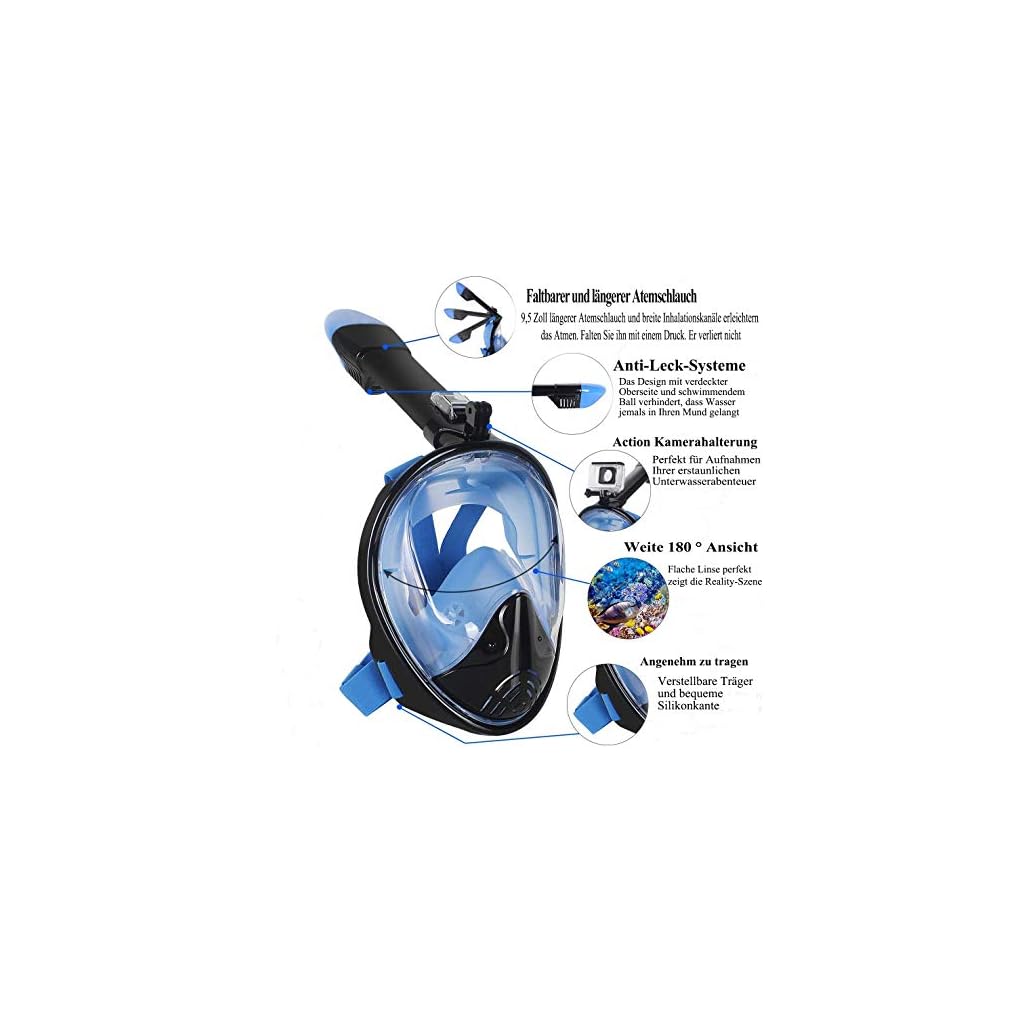 🌊【Humanisiertes Design】Das 180 °Vollgesichtsdesign der Tauchmaske bietet Ihnen die beste Sicht während des Tauchens. Das Antibeschlagdesign der Tauchmaske ermöglicht es Ihnen, die Unterwasserwelt während des Tauchens klar zu sehen. Das auslaufsichere Silikondesign ermöglicht es Ihnen Sie müssen sich keine Sorgen über das Austreten von Meerwasser machen und können so ein komfortables und sicheres Erlebnis beim Schwimmen oder Tauchen gewährleisten